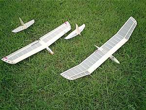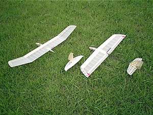 | R21(改)とA11(EP改) R21(改)はR21の主翼にニンフのエポキシグラス胴を使って、尾翼をバルサで作り直しております。 A11はテールパイプをカーボンにして、エルロンサーボ位置を変更し、50XC+GWSペラ+6cell300mAhNiMHを付けています。 |