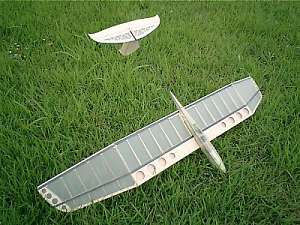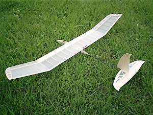 | 尾翼は1.5mmバルサをフリーハンドでカットして、適当にくっ付けております。 このクラスでは全く意味のないミーハー尾翼です。 受信機用電池は150mAhのNiMHで、サーボはドリームプランの5.4gサーボです。 |
