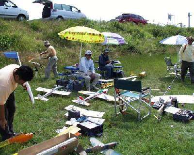 | 総勢8名です、久々ににぎわいました。 本日は、広島県から垰森氏と永岩氏が来てくれました。 垰森氏の機体は、オーガニック(2m)と、ASW28電動改造機です。 |