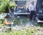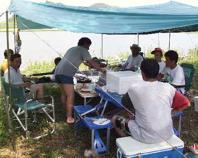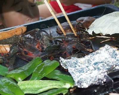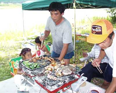 | 本日のメインイベントのバーベキューです。 肉・野菜に加え、高知県らしく「カツオのたたき」、魚介類も豊富です。 あれ?栗生さんの姿がない・・・・・・・・・。 |