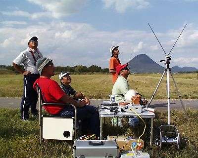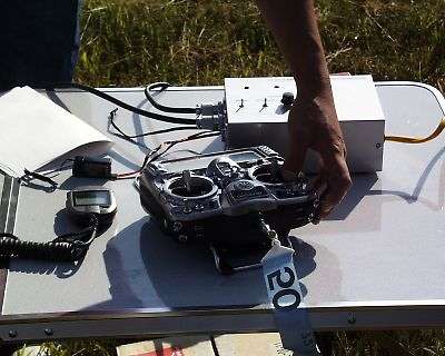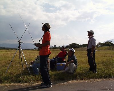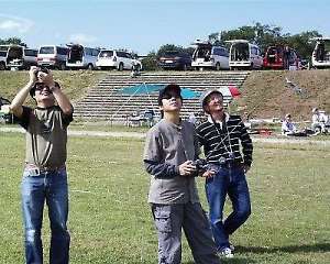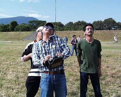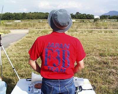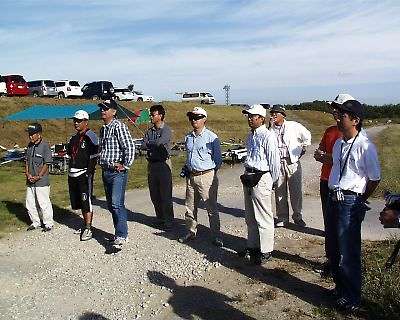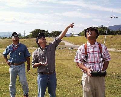 | 操縦中の星野選手とジャッジと助手の坂東氏と上田選手です。 坂東氏「星野さん、こっちが浮いているので来てください!」・・・・ 「はい、はい」と返事ばっかりで、違うところを飛ばしている星野選手です。 「だ・か・ら、言ったじゃないですか!」と言った坂東氏 |