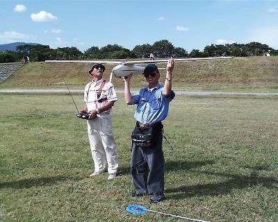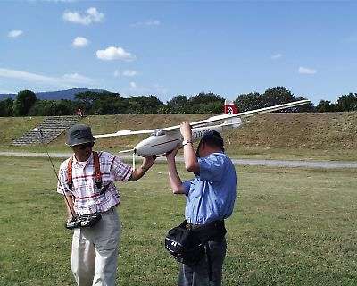 | スタート直前の星野選手です(競技は数年振り)、西井氏です。 機体はサーマル工房製のオリンピアマイゼです。 |