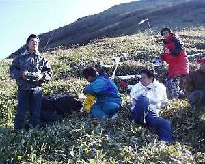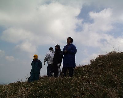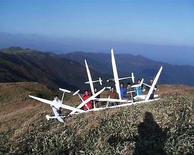 | 深まり行く秋の中津明神山へスロープソアリングへ行ってきました。 フライト後に集合写真を「パチリ」、撮影は高知の山脇さんにお願いしました、ありがとうございました。 中型機に加え大型機が増えてきました。来年のジーズンには5m機も登場予定です。 |