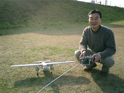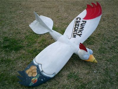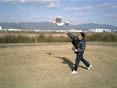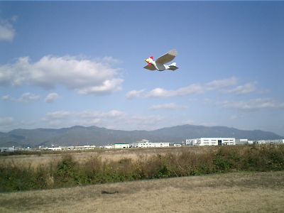 | 午後からは滑空場へ移動し、初飛行会です。(本当は皆さん1月3日に飛ばしているのですが・・・) 年末に荷物に混じっていた?矢野(龍)さんのファンキーチキンです。 これがまた良く飛ぶ!カラーリングは奥様が仕上げました。 ここからの写真は1/3と1/4の写真が混在しています。 |