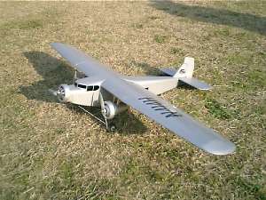 | 矢野(貴)さんと、新作機のフォード トライモータです。 2エルロンサーボ+3モータに改造しています。 受信機はR114Fで、4ch(ラダー)をミキシングで殺して、1chと4chにエルロンを接続、3chがモータコントロール、2chがエレベータとなっています。 |