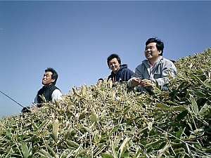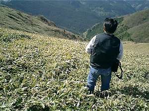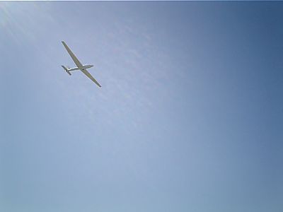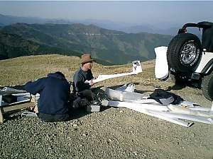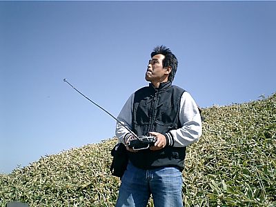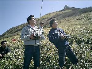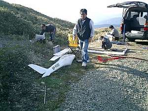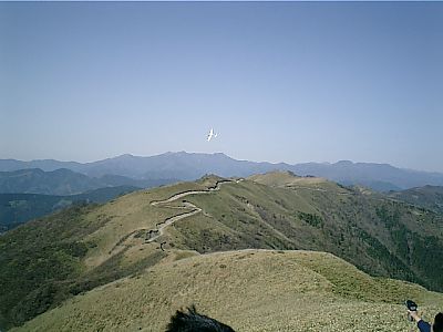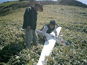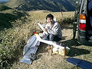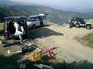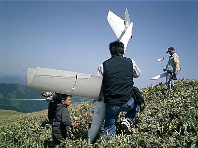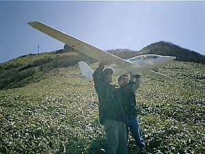 | 「山へ行こう!」の一言で急遽決まり、久しぶりのスロープソアリングでした。 ここは標高約1300m、気温は約20℃、風速5〜8m/sでトレーナ1枚で居れます。 |