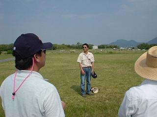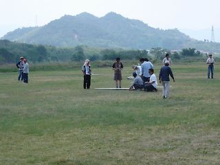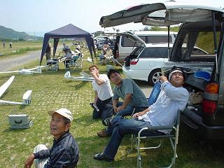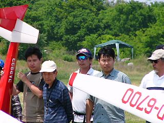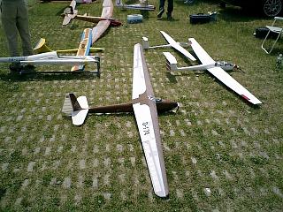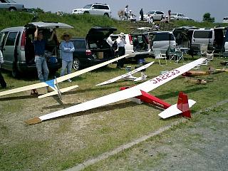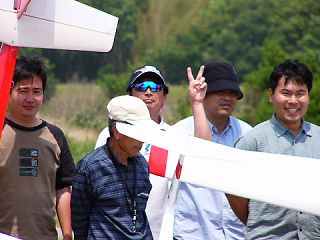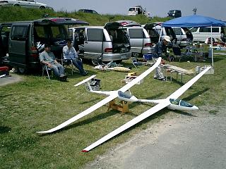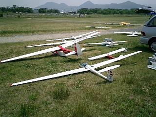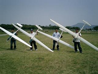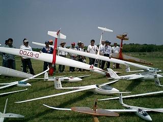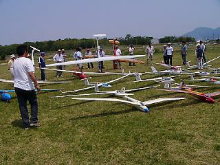 | 右の写真はお昼に撮りました記念写真です。 結婚式の親族写真でもこんなに時間はかけないよ! と言わんばかりの気の配りようです。 それも、「後ろの方、もう少し右に!、その隣の方、す こしうつむき加減に、そうそう!、前の方、こぶしを軽く 握って膝の上にかるく置いてください!、は〜ぃ、笑顔 で一枚いきま〜す!」じゃ無いんですよ、「その機体、 もう少し右に、その茶色いのは少し前に!、そのあた りの機体全体的に機首を右に・・、はいはいそうそう。」 なんです、それもラジコン技術とRCエアワールドさん それぞれ一回ずつ・・。 皆「さすが、プロじゃの〜。」と・・。 翼の長〜い機体は上河さんの7mスパンのASH25です。 |