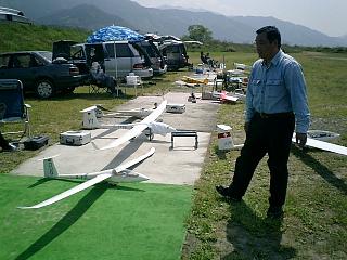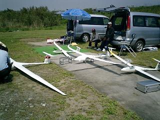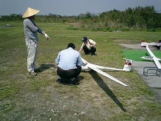 | 本日、初飛行ですので、入念に点検しています。 延長翼もセット済みです。 |