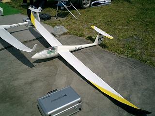 | 坂東さんの新作機DG600(1:3.75 4m-4.8m)です。 カンザシは主翼と一体整形され、相互に翼に差しこむ ウイングインターロッキング方式で剛性があります。 |
