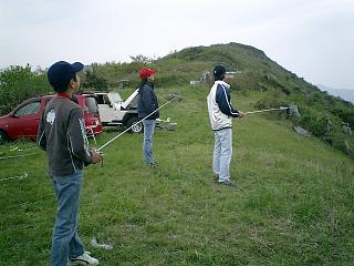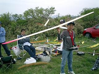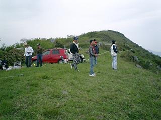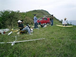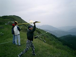 | 今日は、久々のスロープソアリングに出かけました。 GW明けからまるで入梅したような天気が続いていますが、 週末からの天気予報では日曜日が快晴!という事で、 急遽、スロープソアリング!という事になりした。 前日まで、明神山に決まっていたのですが、無風に近い 予報であったことから、朝には「五段高原」と変更になりま した。 愛媛から8人、高知から1人、大阪から2人の計11名です。 本日はリフトバンドが狭く、空中衝突で2機、着陸時の失速 で1機破損いたしました。 |