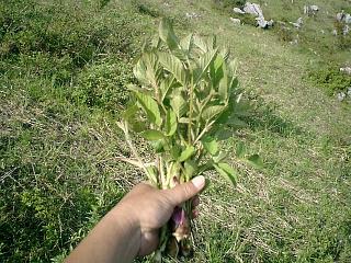 本日の収穫・・・・山ウドです。 計15本ほどありました。 さきほど、皮むきをして、根元の白い部分を生を酢味噌で、 茎は湯がいてドレッシングかけてサラダに、小さい葉と 新芽は天ぷらにして、食べました。一言「旨い!」 天然物の山ウド食ったら、スーパーのは食えねえや! って感じです。 殆どは坂東氏が採って、私が採ったのは1本だけでした。 |