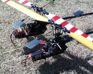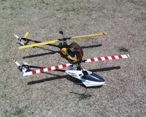 | 上:筋肉番付SP ブラシレス実験機 下:シュワイツァーC300改SR 上空練習機(ブラシモーター仕様) 上空で上下面の区別が付くかと思い、ロータにストライプを入れてみました。 確かに赤白の輪が出来て見やすいのですが、な、なんと上空ではスチロールローターなので下から上の赤が透けて同じように見えました。(^_^;) |
