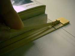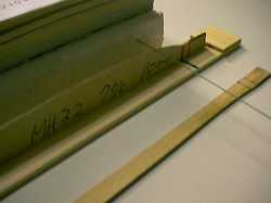 | @翼中央部分の上面カット中 2×8mmのヒノキ棒を1mmの隙間をあけ前後を瞬間接着剤で接着してテンプレートのホルダーを作りました。 台に位置決めして事務用の両面テープで固定しテンプレートをセットて完了です。 |