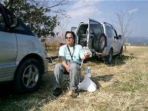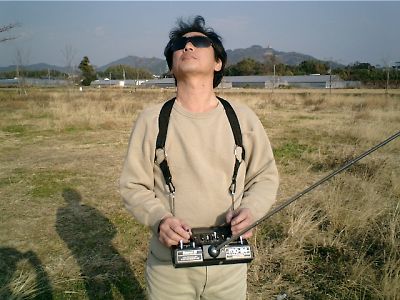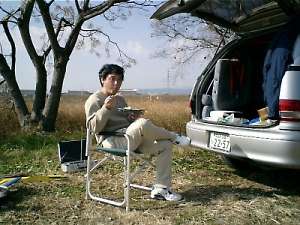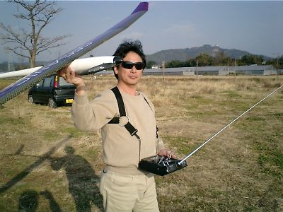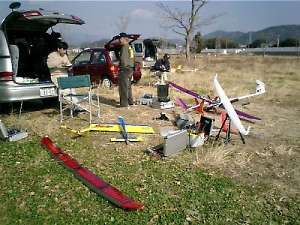 | 機体製作の名手、辻さんです。いつも素晴らしい機体を作ってきます。 午前中のフライトが終わり、昼食タイムです。 それにしても暖かい一日でした。 |