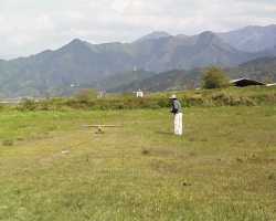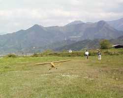 | 曳航中に旋回に入れるとこのクラスの機体は軽く全然テンションがかかっていないので曳航機の軌跡の通り飛ぶ必要があります。 大型機のように常に水平に保つような上げ方をしようとしたのですが、小型機がゆえに機体重量による慣性が全くなく曳航機の外を遠心力も使ってあげる上昇旋回が出来ませんでした。 スポイラー(スポイロン)を出していたのですが、必ずテンションが抜けて「ヒョイ」とインを向き、それで曳航索がたるみ、その後急激にしゃくられて暴れます。 また、離陸時には機体にテンションは全く不要でそのままズルズルと離陸するのが正解てした。 よかった、競技会前に飛ばしておいて・・・・・・・・・・・・。 |