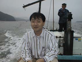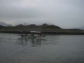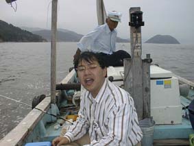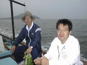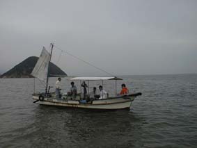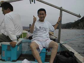 | 2号艇、出航だ、釣れるかな? | 2号艇、遠くから手を振ってる。 | こっちに向かってくる、変な船。 |