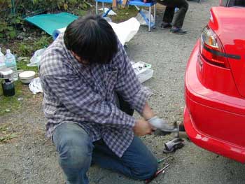 | その頃みこまるさんは。。。 「サイレンサーが奥まで入り過ぎちゃって、抜けなくなっちゃったんすよー。」 ・・・・。けっこー間抜けな作業です。 |