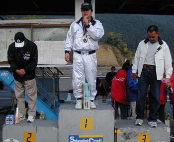 | こちらは旧車Aクラス(一応制限有のクラス)の表彰台三名です。 今回は事務局である酒屋のおっちゃんが優勝しちゃいました。 ちなみに旧車Bクラス(何でも有)では、V.W.のビートルが優勝しました。TIMEが1分9秒台。現行2000cc車より10秒速い。。。どんな車になってるんでしょ? |