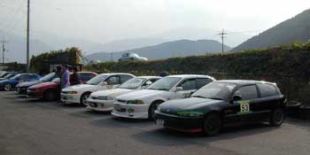 | BOSSが試験後、2時頃に到着しました。徹夜明けで試験に挑み、この時間帯は結構辛かったです。 参加台数は約70台と、今回も多かったんですが、この練習会は相変わらずののんびりモード。バックの風景が「のんびり」を際立たせます。 但し! 下写真の赤い車と青い車の後ろは、工具・シート・スペアタイヤが散乱していました。この二人は結構マジか? ちなみにFFクラスは、参加7台中5台が走破人ご一行で、走破人最速決定戦と化していました。 しかーし! 一本目の結果(ジムカは大体、午前・午後と二本走って良い方の結果とします)を見ると、TOP TIMEは他の車に取られてるじゃないですか。しかも3秒も離されています。 んっ、なになに?インテR(←FF最速と呼ばれてる)が出てる?しかもイジってあるって? んー、トル&アコじゃ勝てんかな? |