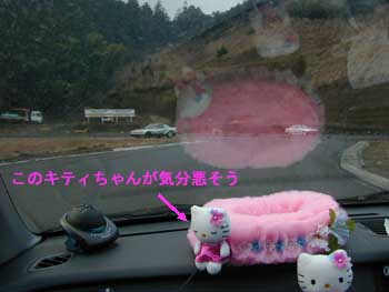 | 生まれて初めて乗る女性の車(ホントか?)。 ん〜、キティちゃんに囲まれてかわいらしいっ! でも、内装とはウラハラに、この直前にサイド引いて、今頃カウンター当てて、全開っっ!って感じなんですけどね。。。 キティちゃんは、酔ってしんどそうです。 途中、縁石に乗り上げ、底がガリガリいってたので 「えぇの?」と、聞くと、 「んー、後で見ます。」と、かわいらしく答えてたんですが、大丈夫だったんでしょうか? なかなか激しい(?)ドライビングでした。 |