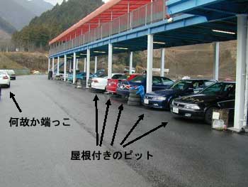 | ピット風景です。右手前の黒から白5台が、トルアコ軍団です。 アナーキーさんは、車種違いの為、仲間外れです(大ウソ)。 昼からの参加だったので、ピットが空いてませんでした。 |