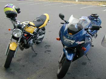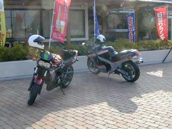 | 今回、走破人BIKEイベント初参戦の2台。 メロン号とよこT号です。 よこTは、この日のためにタイヤ交換してきました。しかも当日上がり。 |