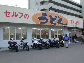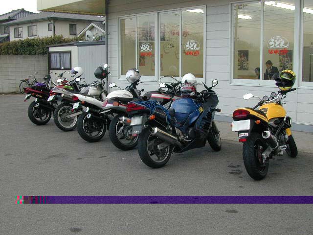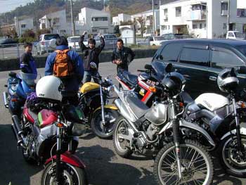 | 参加者 | BIKE手前から よこT(野蛮人=バンディット)、メロン(RF400)、アナーキーZX(ZX-10) MAT←大阪の物好きな人です(XANTHUS)、みこまる(SL230)、BOSS(ご存じの通り) 上の写真に入ってませんが、ゴン太さんも来ました。 |