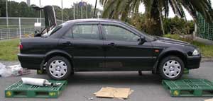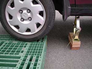 | 車載のジャッキで一カ所ずつUP、下に何か置きます。 今考えれば、前後どちらかは、スロープ付けて登った方が早いですね。 |