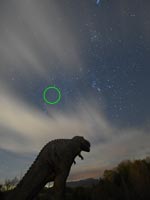 22時、若干雲が多いが出動。例によって、太古の森ティラノサウルスの前だ。南の空を考えていたがそちらは雲が多いので、東北向きににカメラをセット。1分間隔のインターバル撮影を開始(F値:4.0、ISO:2000)した。同時に肉眼での観察も。ふたご座はオリオン座の左、そのあたりから放射線状に流れるはずだ。