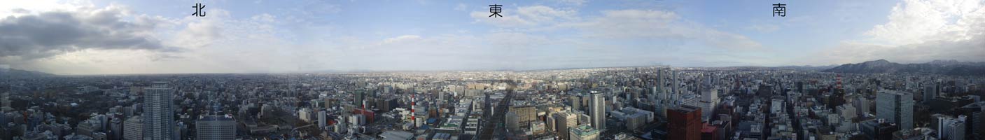わぉ〜、地平線だ〜!?よく見ると遠くに海が光っている。日本海(石狩湾)の水平線のようだ。北西に小樽市らしきところも見える。パノラマにするため北西・北・北東の3枚の写真を撮る。東面、南面、西面でそれぞれ3枚ずつ写真を撮り、つないだものが下のパノラマ。 一点の軸で撮影できなかったので、つながりが悪く、また窓の反射の影響等も出て360度はできなかったm(_ _)m